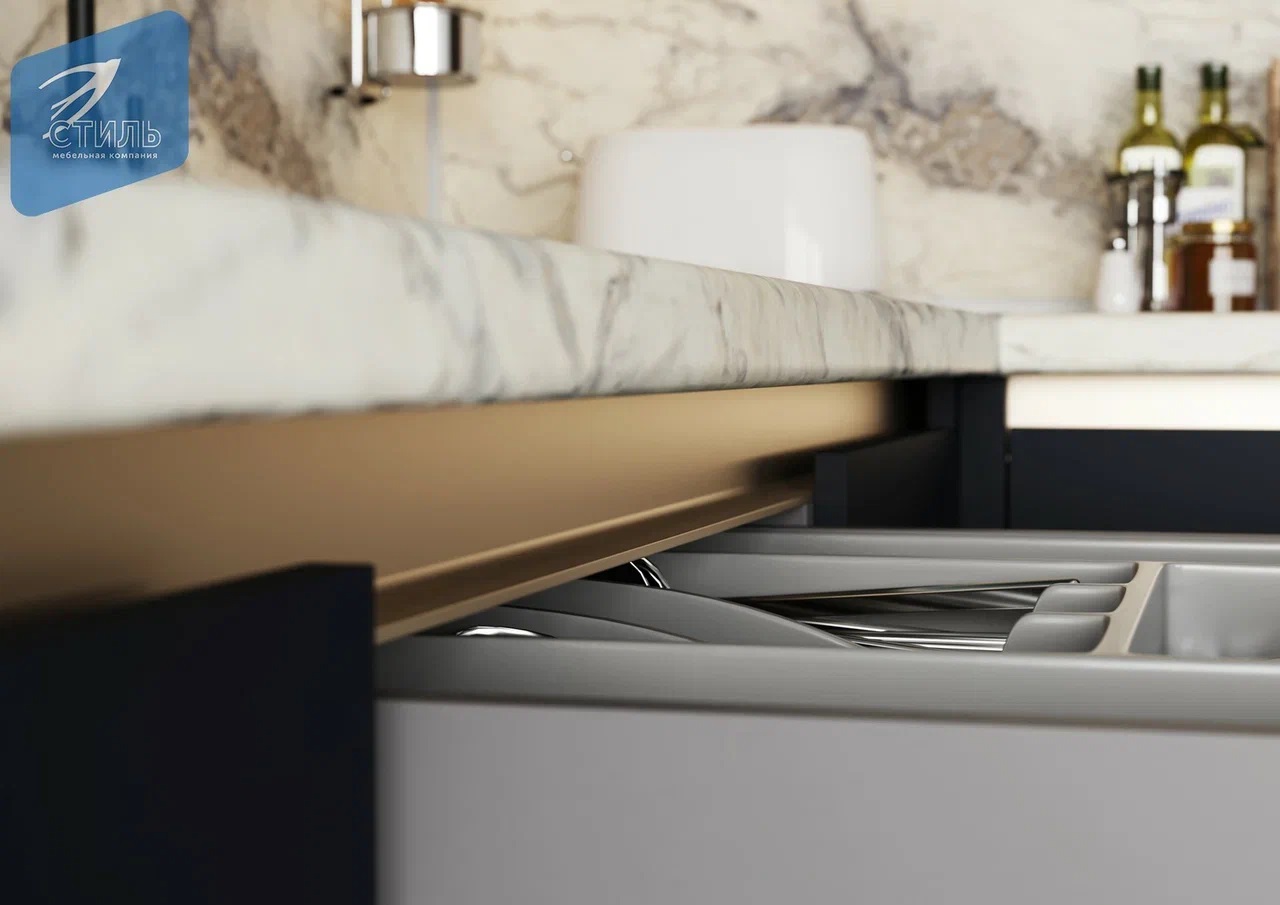 - Нижние модули с ящиками комплектуются направляющими скрытого монтажа с доводчиком.